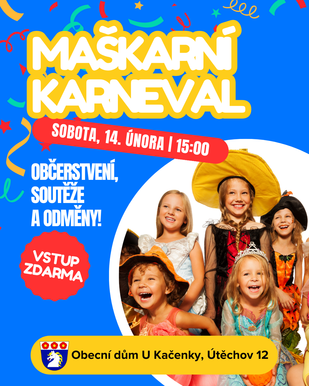 Zveme všechny děti a jejich rodiče na masopustní karneval plný her, tance a zábavy. Čeká vás veselé odpoledne v masopustním duchu, soutěže pro děti a příjemná atmosféra pro malé i velké.